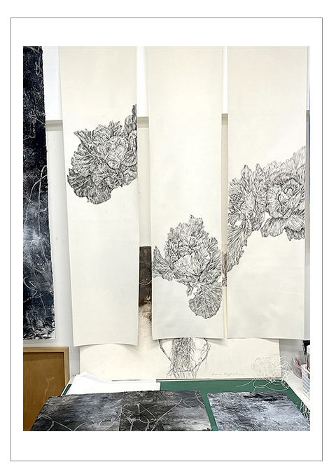 水引きを結び合わせて網のような形状の立体作品を制作する知人の個展会場で、天井に吊り下げられたいくつもの作品が神経回路のように線となって壁に美しい揺れ動く影を映していました。以前から素材として水引きに興味を持っていたので作品の一部を提供してもらい、その素材を版としてプレス機を通し和紙に写し取るという工程から制作を始めました。